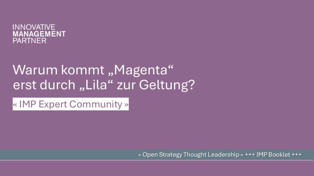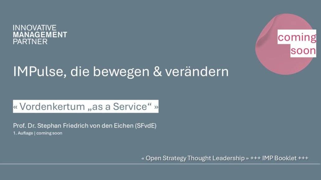 IMPulse stehen für Vorgedachtes und wollen zum Nach- & Überdenken anregen. Das Streben nach zukunftsweisenden Ansätzen sowie der Transfer von Methodenwissen und Anwendungserfahrungen ist tief in der DNA von IMP verwurzelt. Über die Jahre leistet IMP vielbeachtete Beiträge zur internationalen Strategie- & Innovationsdiskussion und füllt die Rolle des Vordenkers immer sichtbarer aus. Heute ist IMP inhaltlich und methodisch anerkannter Thought Leader der Beratungsbranche.